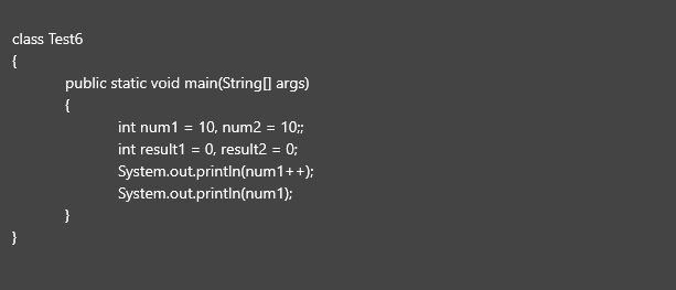 (num1++)의 경우 증감 연산자가 변수 num의 뒤에 있기 때문에 증감 이전의 값 대입되고, 이후의 (num)은 위에서 증감이 이루어지지 않은 10에 증감이 이루어진 후의 값 11이 대입된다.