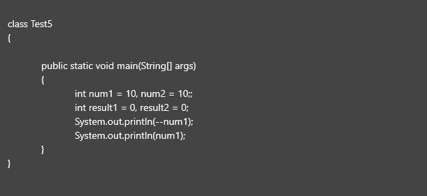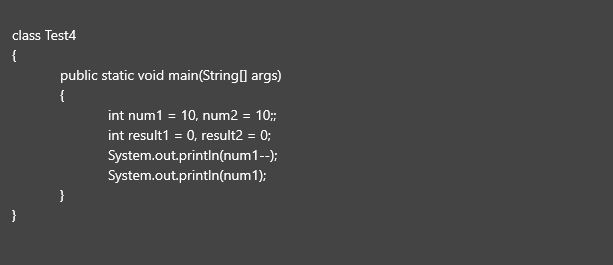 (num1--)의 경우 증감 연산자가 변수 num의 뒤에 있기 때문에 증감 이전의 값 대입되고, 이후의 (num)은 위에서 증감이 이루어지지 않은 10에 증감이 이루어진 후의 값 9가 대입된다.