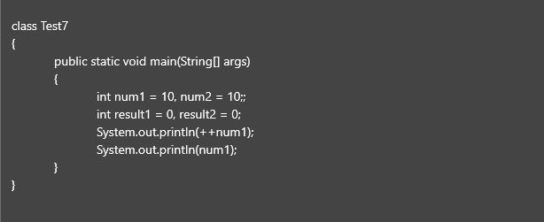 (++num1)의 경우 증감 연산자가 변수 num의 앞에 있기 때문에 증감 이후의 값 11가 대입되고, 이후의 (num)은 위에서 증감이 이미 이루어졌기 때문에 변화한 num의 값 11이 그대로 대입된다.